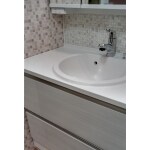 凸凹の陰影が美しいタイル調のテクスチャーで丸い洗面ボールが印象的な洗面に交換しました。継ぎ目のないボール一体型カウンターでサッと拭けてお掃除が楽々。ミラーキャビネットには、置き場所に困る家電や日用品を、出し入れしやすくたっぷり収納でき、洗面室がすっきり片付きます。出し入れしやすいスライド収納です。