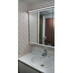 鏡の表面には吸水性・親水性のある膜がコーティングしてあり、ヒーターレスでお風呂上がりもいつもクリアです。洗面空間はクロスとクッションフロアも交換しました。洗面のタイル調のデザインに合わせてデザイン性の高いクロスに交換しました。毎日使う場所だからこそ、お気に入りの空間へ。洗濯機パンの交換もしました。