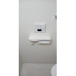 温水便座のリモコンは便座についているタイプでした。 シングルタイプのペーパーホルダーでした。