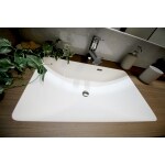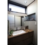 家全体の雰囲気にあわせ、落ち着いた色合いの洗面化粧台をチョイス。上部に設置した幅いっぱいの窓から光が射し、爽やかな朝を迎えられそうです! 洗面台はアイカ工業のスマートサニタリー、ミラーはサンワカンパニーのホテルミラーボックスをチョイスしました。