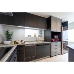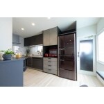 多角形の壁をメリットとして感じて頂けるように、天井形状は多角形の壁に平行になるように斜めでご提案。それだけでもモダンな空間になります。エアコンは天井埋込をご提案し、壁面をスッキリとさせました。 お仏壇を置く収納カウンター、家電収納は造作家具でご提案し、ツートーンにする事によりスタイリッシュさが増します。寸法もしっかりと打合せしました。 TVは壁掛にされるとの事だったので、後の収納を利用しDVDスペースとしてのニッチをご提案。 キッチン側の多角形は変形カウンターをご提案。炭酸水メーカーや圧力窯などの家電をお持ちだったので、使いやすい位置でご提案しました。 イメージは明るい床がお好みだとの事で、そこから全てのコーディネートはお任せ頂き、素敵なスタイリッシュモダンなLDKが完成しました。 ハード面では、しっかりと区画断熱をして、内窓、断熱性の高い窓を入れました。