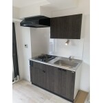 タイル貼りから、掃除しやすいキッチンパネルへ。ビルトインコンロにすることで、入居者の初期投資も抑えられて借りやすく。大き目の吊戸棚で収納アップ。 扉の面材を建具の色味に寄せてお部屋のイメージの統一感をだす。