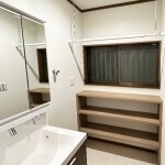 洗面台と洗濯機の間に無駄なスペースがあったため、そのスペース分を有効活用し、オープン棚付きの作業スペースを提案・施工しました。