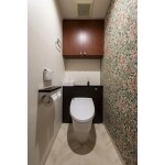 トイレはキャビネットと一体型を、アクセントにはウィリアム・モリスが手掛けたデザインのクロスをご提案しました。 スイカズラの花が空間を重くしすぎない、華やかな印象を与えます。