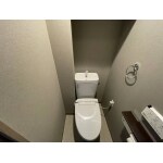 ウォシュレット付きのトイレ、新たに造作棚とカウンターを採用した紙巻き器に変更し使い勝手の良いトイレになりました。
