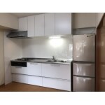 施工後写真。吊戸棚の高さが変わりました。洗い物をする際に前方が広く頭をぶつける心配が無くなりました。