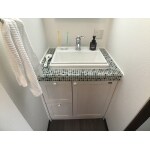 洗面所内は、壁・天井・床と木調で、全体的に 暗さを感じる内部でした。 今回、壁と天井のクロスを白に張り替えて タイルを使用したデザイン重視の洗面化粧台チェンジ、 清潔感のある洗面スペースにリフレッシュしました。