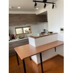 キッチンの対面に収納ユニットを設置して取り外し可能なカウンターテーブルを特注で設置させていただきました。