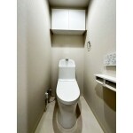 カウンターや手洗器のカラーがアクセントになったトイレ空間