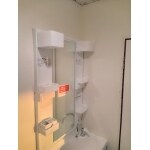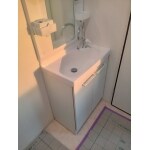 ミラーキャビネットにはくもり止めコートが施され、消費電力ゼロで快適に使用できます。 収納の取っ手は、タオル掛けにもなる嬉しい幅。収納がなかった以前に比べ、すっきりと必要なものが収まります。 クロスとクッションフロアも交換し、気持ちよく使える洗面スペースになりました。
