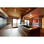 クリナップ製のセントロでインパクトのあるキッチンを設置しましょう。背面カップボード部分にはタイルを貼り、天井は木の板で仕上げ、全体的にムードのある空間に。