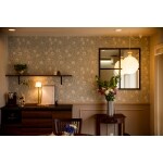 間取りは大きくは変えず、和室6畳と押入から和室4.5畳とウォークインクローゼットに。リビングと和室に繋がる段差をバリアフリーにしてカーペットからフロアに。キッチン前の無機質なキッチンパネルの上には上品な艶とアンティークな雰囲気を醸し出した青みがかったタイルを貼り、キッチンを取替しなくても上質なキッチン空間に生まれ変わりました。既存の家電収納の高さに合わせて東西の壁は腰壁にモールディングを装飾しミルクティー色で柔らかい雰囲気にしました。奥様が長年憧れていたウィリアムモリスの壁紙の中から一目ぼれしたピュアモリスのフルーツシリーズを東面の腰壁から上に貼り、部屋全体のアクセントに。リビングドアを開けた時の対角線上にオリジナルミラーとレクリントのペンダントライトでフォーカルポイントを作りました。