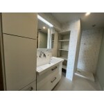 浴室出入口を変更し出来た奥行きに洗濯パンを移設。空いたスペースを利用し洗面化粧台を大きく新設し広々と使用できる空間になりました。