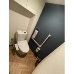 施主様のご希望だったヘリンボーン柄の床に、当社からご提案させていただいたダークカラーのアクセントクロスでとてもおしゃれなトイレ空間ができあがりました。