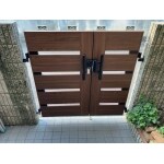 門柱を新たに建てると扉が小さくなってしまうので、既存の吊元金具を再利用して扉の大きさを変えず。なおかつ玄関ドアと同じウッディ調に仕上げさせていただきました。