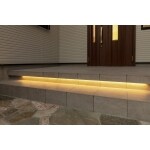 | その他採用機器・設備 | 【乱形タイル】 ユニソン クレモナストーン ゴールデンイエロー 【ブロック塀タイル】 LIXIL ラグナロックモナリサ 【ポーチ・スロープタイル】 東洋工業 クオリ―ストーン S10WT 【階段足元照明】 LIXIL シンプルラインライト |