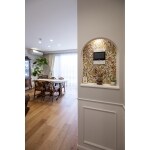 向きを変え明るく開放的なキッチンになりました。壁の下部には腰壁のモールディングを。「キッチンの框扉と併せて一体感がある!」と特に喜んで頂くことができました。