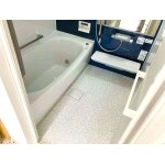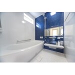 浴室内を広々と見せるために、横長の鏡を採用しました。アクセントパネルには施主様の好きな青色を取り入れました。 浴槽は『高断熱浴槽』となっており、長時間の入浴でもお湯のの温度がほぼ下がらず、温かい状態を保ち続けます。