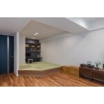 間仕切り壁や建具をなくし、広々したリビング。和の趣は残しておきたいというご夫妻の希望で、リビングの一角に小上がりの畳スペースを設けました。小上がりの床を一部掘り下げカウンターデスクを造作。アクセントにネイビーのクロスを貼り、さまざまな使い方ができる、フリースペースとなりました。生活のしやすさとデザイン性を高めるため、通路側の角を斜めに設計する工夫をしています。