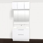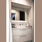 人造大理石(ポリエステル樹脂)カウンターのINAXエルシーは「お掃除、空間すっきり、スマートドレッサー」となっています。また、きれいを保つ機能性が多く盛り込まれているだけでなく、散らばりがちなヘアゴムなどのメイク小物を収納するのにピッタリなポケット収納など、ただ大容量の収納だけでない便利な収納もたくさんあることもお勧めPointでした。洗濯機上にかけていた洗濯ポールは浴室に移動しましたので、洗濯機周りに隙間ピッタリサイズの使いやすい収納の増設をご提案させていただきました。