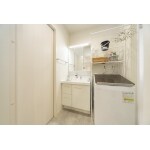 洗面・脱衣室を1つの空間にしました。 天井にはロールカーテンを設置し、手軽に間仕切ることができます。 白色を基調とした明るい印象になりました。