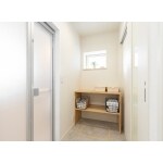 洗面化粧台から脱衣室を1つの空間にすることで、アクセスがスムーズになります。 また洗面と脱衣室の間にはロールカーテンを設置しました。 扉を設けるよりも手軽な仕切りとなり、圧迫感も和らぎます。 そして、来客時でもプライベート空間を隠すことができます。