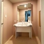 ゆとりのある配置で介助し易い空間を確保できました。車椅子に乗ったまま洗面化粧台の奥まで足がすっぽり入り、ゆったり介助できるようになりました。壁紙のお色を温かみのあるペールオレンジ色にしました。