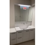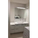 第一希望の商品でリフォームする内容でご提案させていただきました。 洗面化粧台は、上から水が出るので水栓周りに水がたまらずお掃除が簡単です。 バックガードがミラー下まであり、洗面ボウルと一体形成のカウンター。継ぎ目などの凹凸がないので飛び散った水滴もさっとひと拭きでキレイが保てます。 洗面器容量は16L の大容量です。 タッチレス水栓は水栓をきれいに保つことができ、水の出しっぱなしも防止でき、すぐにお湯が出るので捨て水も待ち時間もなく、節水ができます。 引き出し式と開き戸の2タイプのキャビネットは隅々まで入り、大容量収納でストックもたっぷりしまえます。 たっぷりの収納力と広々空間を両立しました。 対応の早さや、提案内容にご納得いただき、満足のいくスペースになったとお褒めのお言葉をいただきました。