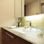 TOTOショールームにて、光を通過する美しい素材「クリスタルカウンター」に一目ぼれ。 浴室のアクセントパネル(マルキーナーグレー)と合わせて、柄入りのクリスタルカウンター「霞」をご採用いただきました。 面材は既存の建具やタイルと馴染みのよいミディアムウッドに。
