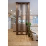 以前は個室として使用していた2階の南側をリビングに変えました。スケルトン状態から工事を行ったことで、耐震改修と合せて窓の位置も見直しました。また、既存の窓を1つ塞ぎ、壁面収納とテレビを壁付けで設置。エコカラットや間接照明を取り入れました。構造上残ってしまった柱は、ルーバーと同化させることで、空間のアクセントに。日当たりがよく、高級感のあるくつろぎスペースが完成しました。