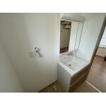オリジナル木製鏡がポイントの洗面台リフォーム