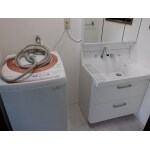 60cmタイプの洗面台・収納棚・洗濯機(洗濯パンなし)の並びで配置されていました。
