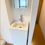狭小空間にぴったり収まったコンパクト洗面台。シンクは人口大理石製でマット仕上げのスクエアフォルムのシンクです。キャビネット部は取手のない”プッシュオープン式”でフラットさを強調しています。上部にスキンケアグッズを収納できるミラー付きのコスメキャビネットをお付けしました。