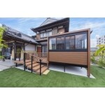 既存の門袖、アプローチ、階段を取り壊し、車いすでも簡単に上ることができるスロープを設置。スロープの両袖には季節を楽しめる植栽とライティングを施し、来客にも楽しんでもらえるような設計にしました。アプローチを上がり切りスライド門扉を開けるとリビングに繋がる庭が広がります。大きな掃き出し窓には間口いっぱい人工木のデッキとガーデンルームを設置しました。腰壁をL字にしたことにより道路からのプライバシー対策にもなり、日光浴や趣味に没頭できるお気に入りの空間になりました。ガーデンルームから繋がるウッドデッキには手すりとゆとりのある階段を設け、お庭への動線も歩きやすくなりました。
