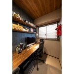天井は木目のクロスをあしらい、デスクカウンターは深みのあるウォルナットを採用。 アクセントクロスにはネイビーを施工し、施主様お好みのヴィンテージテイストに仕上げました。