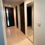 玄関側から見ると、新しく設置した上下ステンレスフレームの姿見は、W500XH1800の大き目サイズですが、周りの雰囲気に自然な仕方でなじんでいます。