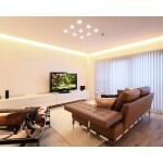 whiteを基調にblackとbrownのコントラストに天井高の調整により、床の段差と合わせてコーニス照明とダウンライトの計画を提案しました。