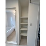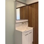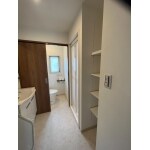 入口にサイズオーダーした引き違い戸を新設しプライバシーを確保しました。洗面室奥のトイレのドアは開き戸から片引き戸に変更したことで、洗面室を広く使えるように。収納棚を設置し片付けやすくなりました。清潔感のある水色のアクセントクロスと床をトイレと共通にしたことで統一感が出ました。