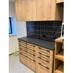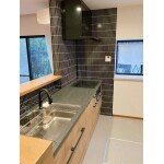 吊戸棚を無くし、オープンにすることで解放感が増し、一段と使い勝手の良いキッチンに生まれ変わりました。吊戸棚を無くしても下台と背面キャビネットの収納力でカバーすることができ、問題ありません。 またブラック系のタイルとウッド系のキッチンカラーが合わさって、お洒落な空間に仕上がっています。