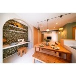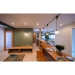 キッチンのレイアウトを南北に配置して横並びにダイニングテーブルを設置。キッチンを中心にくるくるとお母さんが回れるように、玄関からパントリー、デスクコーナー、キッチン、ダイニングテーブル。そしてその傍らにミシンコーナーを設けてタイルや壁紙、照明をお持ちになっていたダイニングテーブルに合わせてご提案しました。