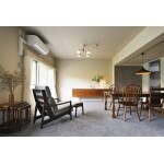 カーペットはこだわりの高密度ウール100%のものに交換。ヘタリが少なく、冬の暖かさはもちろん夏の素足にも気持ちよく、表面の毛を汚れと共に掃除機で吸い取れば綺麗を保てるなど、機能的にも優れています。建具は壊れている箇所以外はグレーに塗装してそのまま残しました。ダイニングの壁面の造り付け収納も、錠が壊れていた扉だけ交換して入口とお揃いにしてコストダウン。全てを撤去することは簡単ですが、むやみに解体せず、その家の歴史と対話しながらイメージを一新する、地球にもお財布にも優しいリノベーションも積極的にご提案しています。