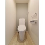 フチレス形状とお掃除リフトアップ、アクアセラミック採用の、清掃性の良い製品を選択致しました。 クッションフロアに色の濃いものを使用し、壁クロスの一部をアクセントにする事で、奥行と清潔感のあるトイレになるようご提案させて頂きました。