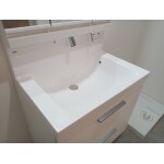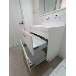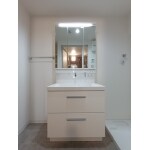 洗面化粧台下がフルスライドタイプの収納で、奥まで効率よくご使用頂けます。 元々、洗面化粧台に照明が付いておらず暗かった為、今回はLEDのスッキリとした照明をご提案致しました。清掃性に関しては、一般的な水栓ではなく「きれいアップ水栓」採用の製品の為、拭き掃除の手間が殆どありません。
