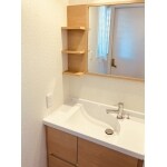 洗面室の空間をうまく生かせるように、奥行きのコンパクトなエスタをご提案しました。木目調のクリエペール色は既存のライトにもなじみやすく、温かい雰囲気の洗面室になりました。