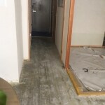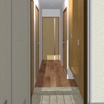 廊下側から玄関を望む。フローリング張替えと壁天井クロスを貼り換える予定です。全体的に優しいブラウン色で統一された配色になっていました。