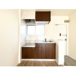 機能充実のコンパクトキッチンにお取替え。扉カラーの濃色ブラウンのウォールナット柄が空間のアクセントに。高級感があり落ち着いた印象になりました。