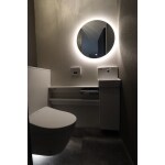 間接照明を鏡背面とトイレ足元に設置。 モノトーンな内装をより引き立ててくれます。
