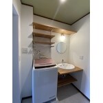 水栓、排水の位置を替えて、洗面台の間口を800に広げて、圧迫感のあったBOX収納をなくしてオープンで開放的で木目が優しい洗面空間になりました。