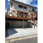 LIXILカーポートネスカF、LIXILフェンス、スポットライトセンサー付、天然木(杉)ウッドデッキ、人工芝 |