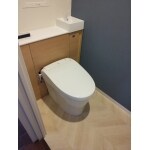 ご採用頂きましたLIXILリフォレはトイレの後ろと壁の間にすき間がないデザインで、タンクや給水管、コードもキャビネットの中にしまえるため、見た目のジャマをすることがありません。また、マンションリフォームでトイレ空間に排水立管がある場合でも立管をキャビネットの中に隠せます。